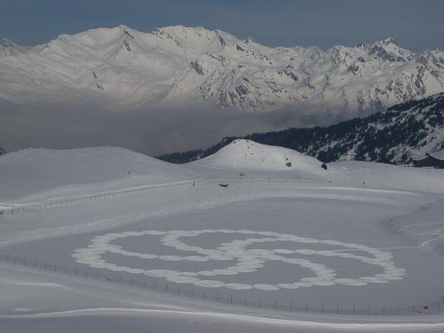 Crop circle ini bukanlah buatan makhluk asing tetapi ia adalah buatan tangan Simon Beck. Untuk menghasilkan karyanya, permukaan ais sebesar padang bola sepak, kompas dan sepasang kasut salji diperlukan.